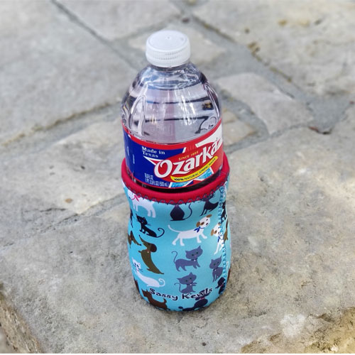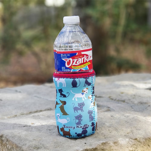 Riley Sassy Kewls Koozie dogs and cats themed koozie on a blue background with red trim and blue stitching Keeps your drink Cold or Hot longer Protects your furniture from condensation and water rings Protects your favorite drink cup or glass container Made of durable machine washable neoprene Zig Zag stitched for maximum strength Conforms to fit 8oz to 16 oz bottles and cansReviews